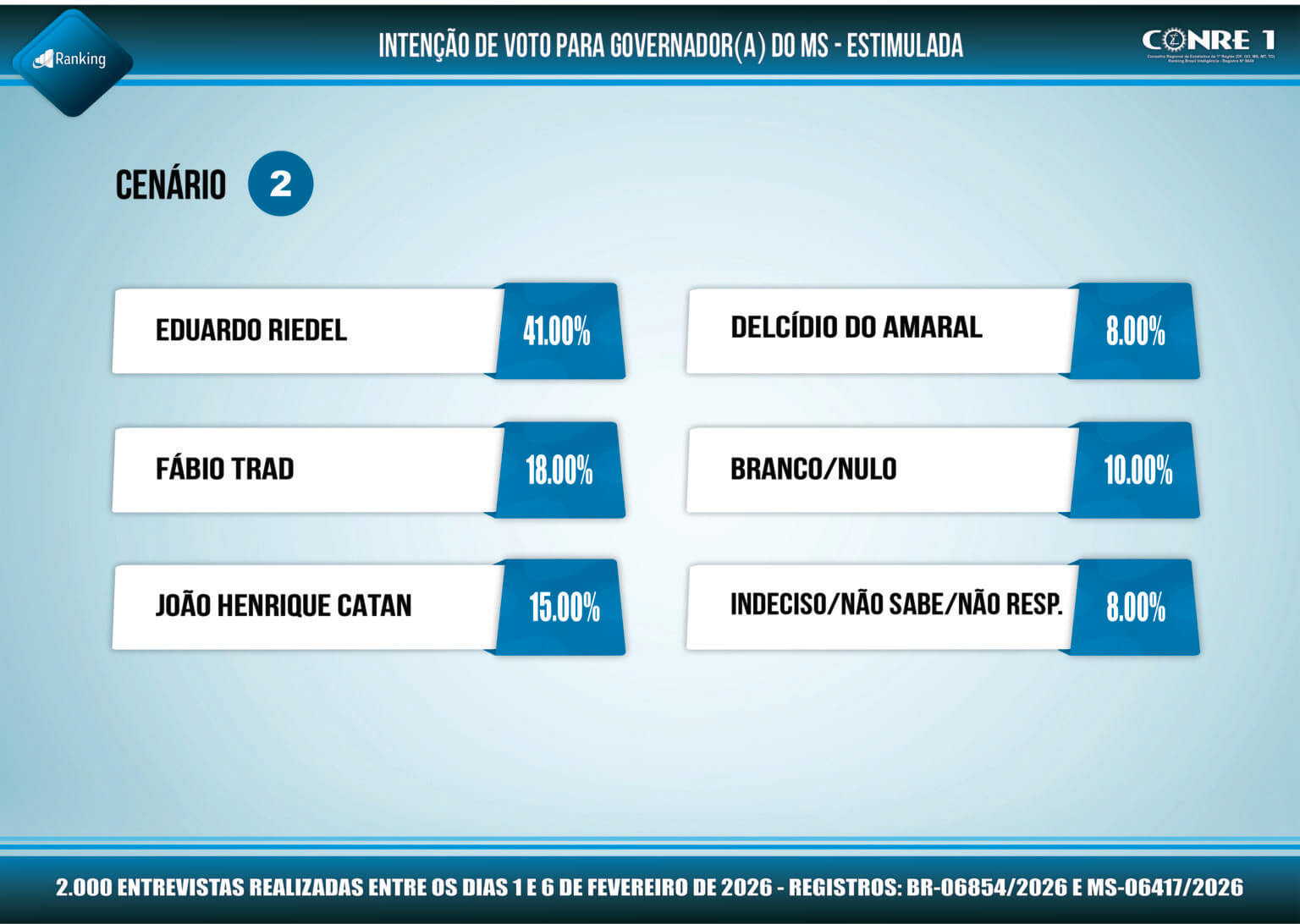 Já no segundo cenário Riedel ainda lidera, com 41% das intenções de votos, seguido por Fábio Trad, com 18%, Catan, com 15%, e Delcídio, com 8%, sendo que 10% vão votar em branco ou nulo e 8% não sabem ou não responderam.