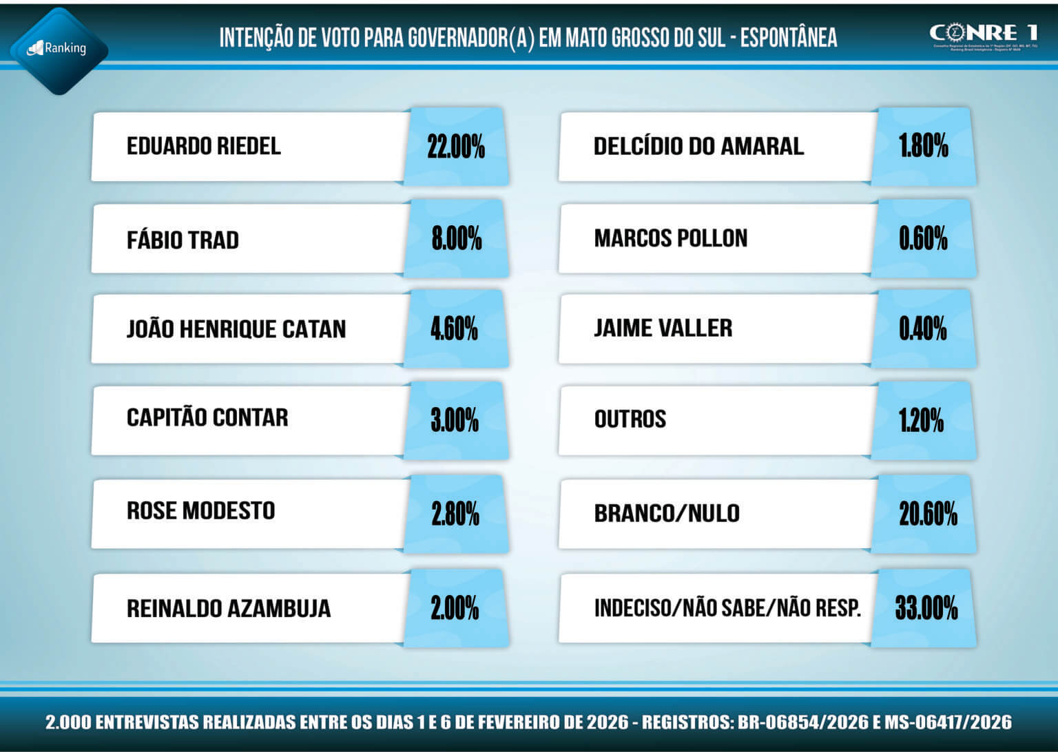 Pesquisa registrada no TSE (Tribunal Superior Eleitoral) com os números; BR-06854/2026 e MS-06417/2026, o Instituto Ranking Brasil Inteligência realizou, no período de 1º a 6 de fevereiro deste ano, junto a 2.000 moradores com 16 anos ou mais de idade, em 30 municípios de Mato Grosso do Sul, com intervalo de confiança de 95% e margem de erro de 2,2 pontos percentuais para mais ou para menos, pesquisa sobre as intenções de votos para governador nas eleições gerais de 2026 no Estado.